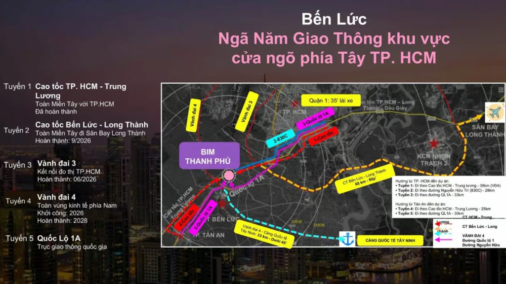 Dự án nằm ngay nút giao quan trọng kết nối với Cao tốc TP.HCM – Trung Lương và Cao tốc Bến Lức – Long Thành. Điều này giúp việc di chuyển về TP.HCM chỉ mất khoảng 20-30 phút, đón đầu cho xu hướng ly tâm, chuyển dịch nơi ở từ nội đô chật chội ra vùng ven thoáng đãng. Đặc biệt, sự hoàn thiện của các tuyến vành đai và hạ tầng giao thông liên tỉnh xung quanh Bến Lức đang tạo ra một cú hích cực lớn, biến khu vực này thành trạm trung chuyển logistics trọng điểm của khu vực phía Nam. Từ đây cư dân có thể dễ dàng di chuyển đến nhiều trung tâm công nghiệp, dịch vụ, sân quốc tế,…ở khu vực miền Nam.