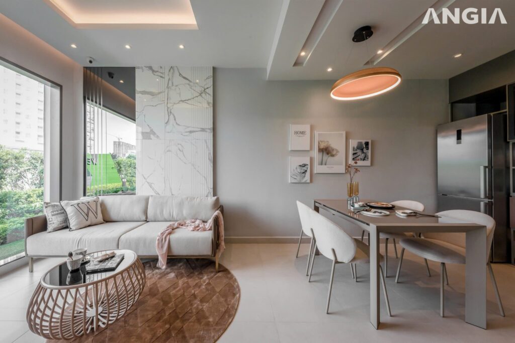 Các căn hộ được thiết kế theo phong cách hiện đại, tối ưu ánh sáng và thông gió tự nhiên, bố trí không gian liên thông giữa phòng khách – bếp – phòng ngủ nhằm gia tăng cảm giác rộng rãi và tiện nghi.