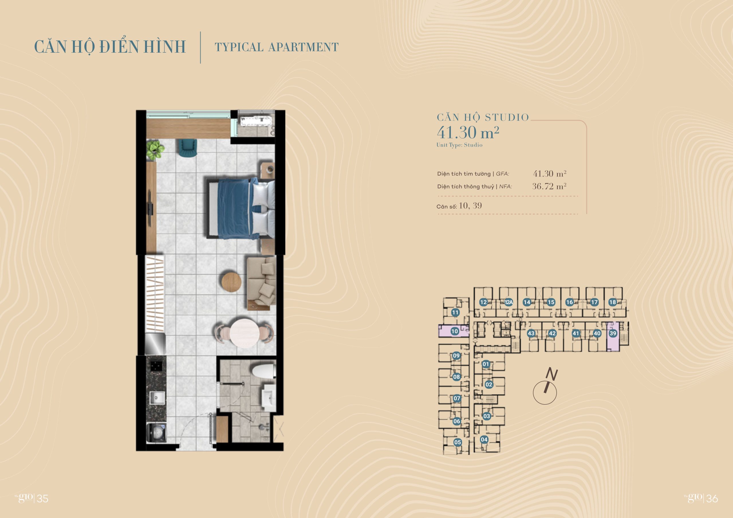 • Căn 1PN diện tích 40m2: Chiếm tỉ lệ 10%