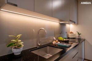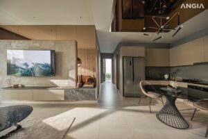 Bố cục nội thất được nghiên cứu theo phong cách hiện đại và tinh gọn, chú trọng tính thẩm mỹ song song với công năng. Không gian phòng khách – bếp – phòng ăn thiết kế liên thông nhằm gia tăng độ mở và tạo cảm giác rộng rãi hơn so với diện tích thực tế. Các phòng ngủ được bố trí hợp lý, đảm bảo sự yên tĩnh và riêng tư nhưng vẫn kết nối hài hòa với tổng thể căn hộ.